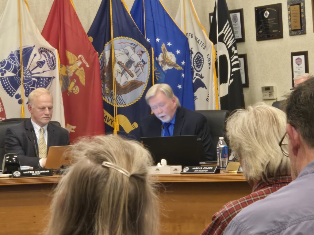 Biddeford City Manager James Bennett (right) addresses the City Council and members of the public regarding his planned resignation.