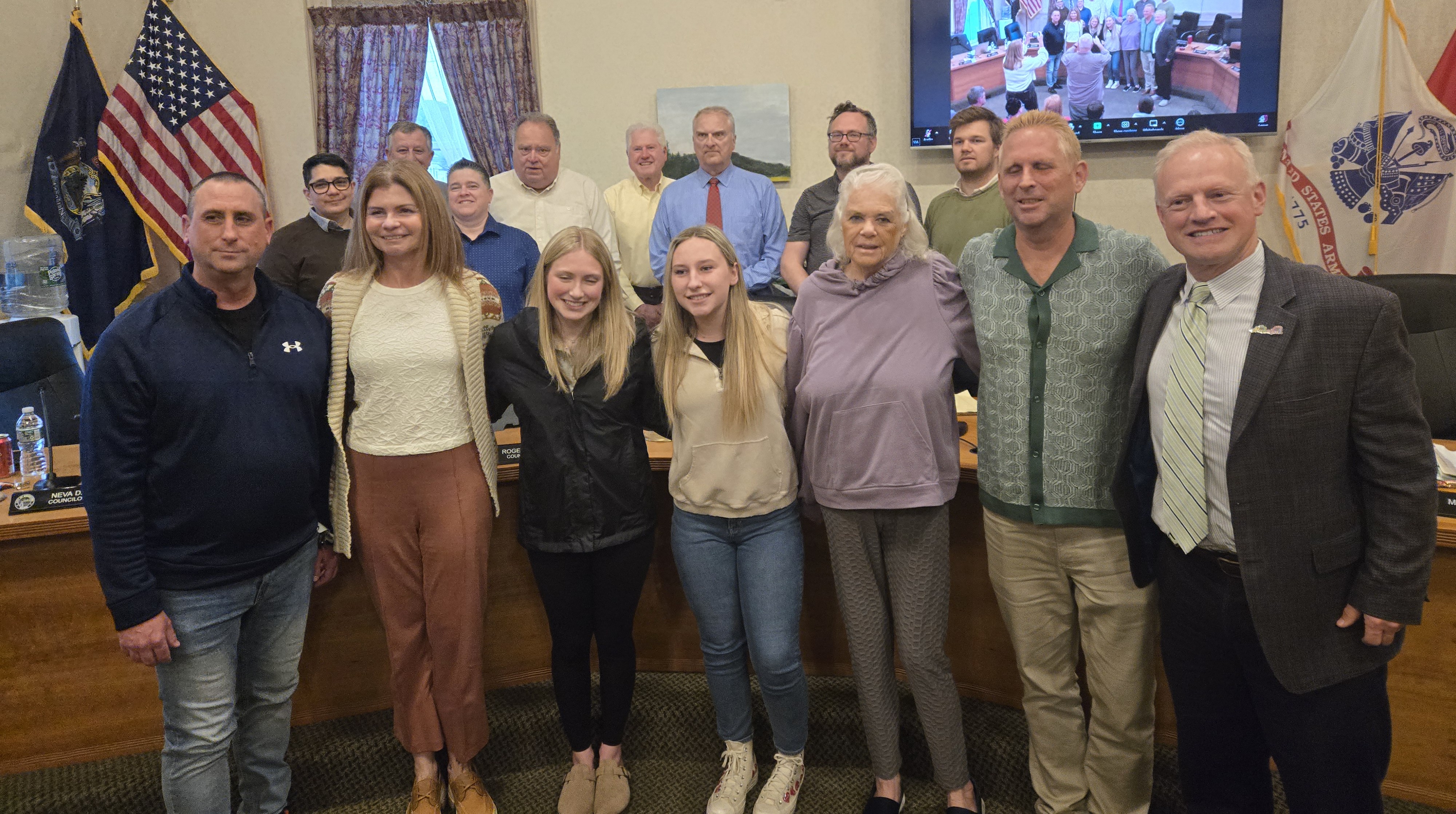 Members of Vincent Keely’s family pose with Mayor Marty Grohman (far right) and members of the Biddeford City Council to honor a man who has left a lasting legacy of respect and cordiality (Seaver photo)